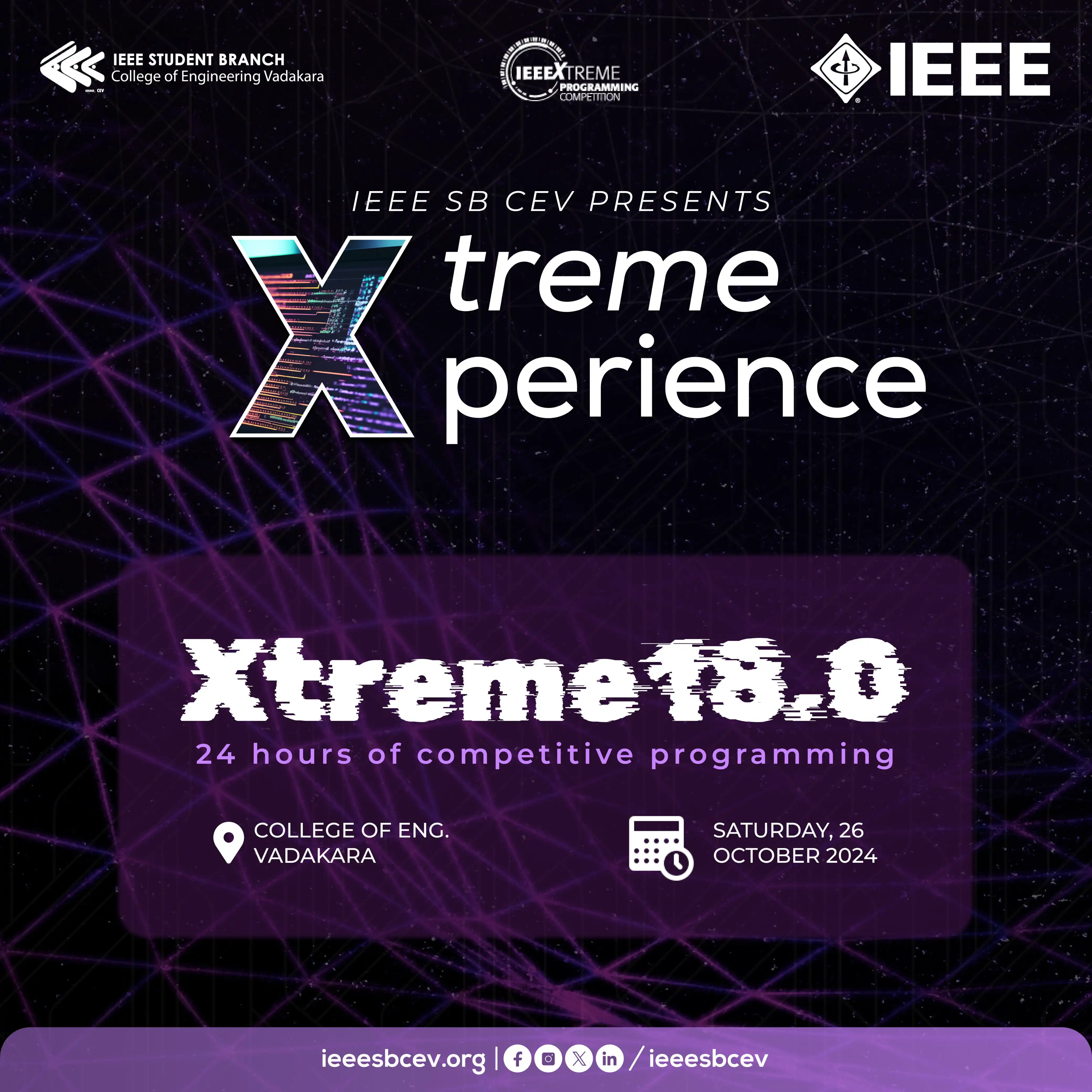 Mark your calendars for the IEEE Xtreme18.0, A 24-hour coding marathon happening on 26th October 2024 at CEV hosted by IEEE SB CEV. Prepare for an intense programming experience! Get ready to code non-stop and test your skills in this global challenge!